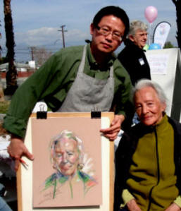 The hardest genre in the world of art is surely portraiture. To capture the fleeting moments of a person’s soul carries more complexity and perception than merely chasing the effects of light. I say this as an avid landscape painter who has always had the utmost respect for this art form. Recently I had the opportunity to observe the portrait artist Frank Yang at work. He was creating live on-site pastel drawings. The models happened to be my 87 year old mother in law and her 57 year old daughter. Neither had ever had their portraits painted before. Mr. Yang was performing with pastel in the open air, side walk style. Now one might presume that portraits done in this manner might have an effected look, caricatures, born of technique that is often applied to each and every sitter in the same way. So I was astonished at Mr. Yang’s results. He had in both portraits captured their unique inner spirit. He was able in the brightness of the day to see into their personalities. He understood them at some hidden level. He draws with an active and quick hand. He knows his anatomy well. Colors never are over worked. They converge with a vigor that resonates with a life force that is more than simple animation. They capture the sitter in the fleeting moment of time. My aged mother is seen with all her beauty intact, yet no enhancement was added, no embellishment to falsify the character. He painted her has she is and yet left the imprint of nobility and long suffering that is the integrity of her being. With my sister in law he rendered a likeness that is both uncanny and empathetic. She is celebrated in her true nature. Middle aged, mother of three, now divorced, yet willfully determined and more curious in life than ever before. He captured this deeper character, her resilient and true nature that neither camera nor mirror can ever see.